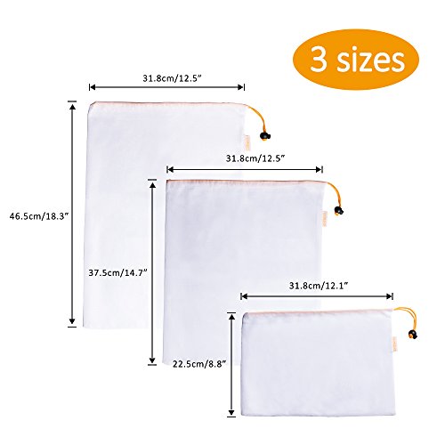 PRODUCT SIZE: This set of 12 reusable drawstring produce bags are easy to clean, hand or machine washable and will not degrade or shrink. 3 sizes include large (12.5" x 18"), medium (12.5"x15") and small (12.5"x9"), enough for most fruit and vegetable purchases.