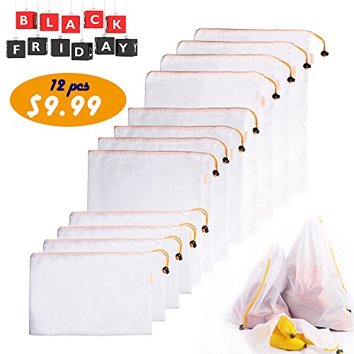 [Set of 12] Reusable Produce Bag, Washable Premium Mesh, Large, Medium & Small, Double-Stitched Strength, Eco Friendly Net for Grocery Shopping & Storage of Fruit Vegetable Toys