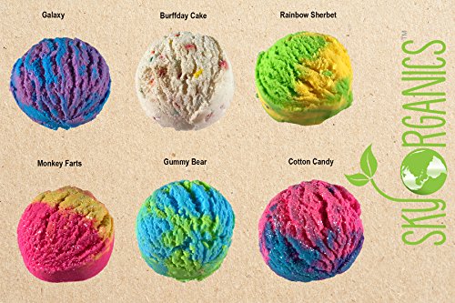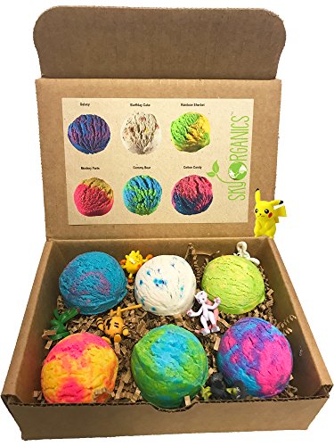 -. Feature : WE TAKE BATH TIME SERIOUSLY - seriously fun, that is. Settle in for a wonderful immersion with an original Sky Organics invention, exploding with organic essential oils, organic Cocoa Butter and tons of bubble fun. Our bubble bath scoops offer a relaxing, invigorating multilayered explosion of color and scent. There's a bubble scoop perfect for every occasion. / SUPER FUN GIFT SET OF 6 HUGE BUBBLE SCOOPS - this set contains 6 (six) assorted bubble scoops and the box contains six surP.R.Ise Pokémon toys (loose in box). Those are not bath bombs and they don't fizz. They create bubbles! / HAND-CRAFTED WITH LOVE IN THE USA- alLof our ultra lush bubble cakes are unique creations made by hand in the USA. This gift set contains these 6 amazing scentsGalaxy, Burrfday Cake, Rainbow Sherbert Monkey Farts, Gummy Bear and Cotton Candy / UTILIZING ONLY THE FINEST NATURAL AND ORGANIC INGREDIENTS - our bath fizzies will leave your skin hydrated and moisturized. Our unique blend of organic essential oils and butter will ensure that you will leave your bath feeling relaxed and renewed. / 100% NATURAL BUBBLE SCOOPS THAT WON'T STAIN YOUR TUB - benefit from a product that's entirely natural and contains no artificial flavors or colors. Sky Organics bath bombs take care of your skin and your stress in an organic and holistic manner!