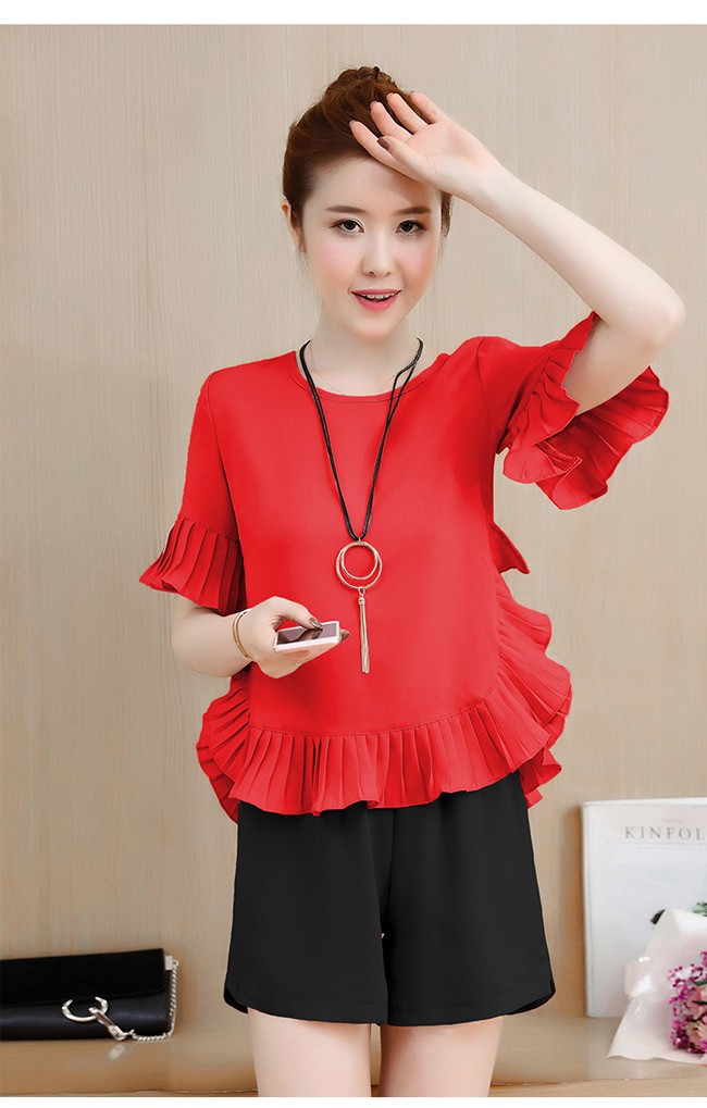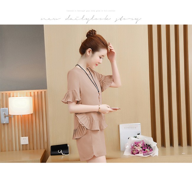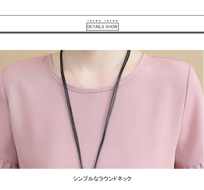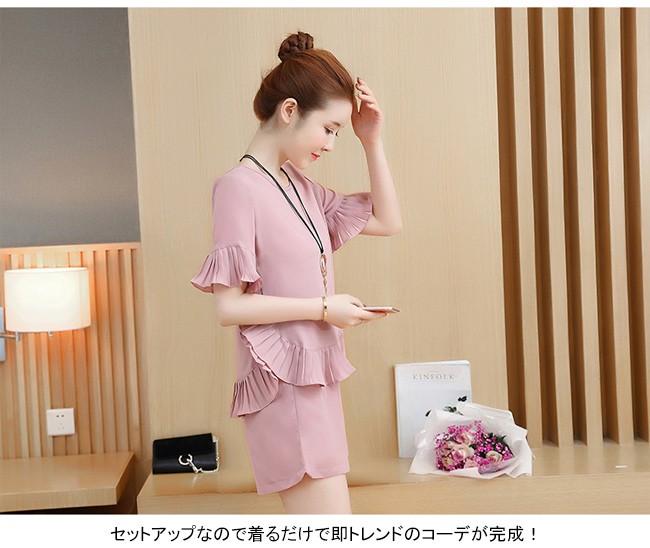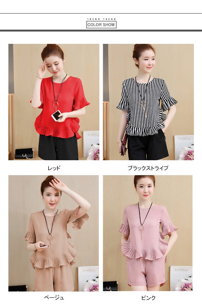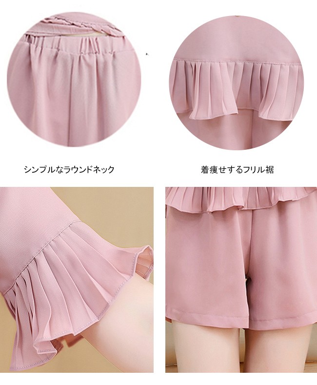 | 商品名 | 2点セット セットアップ 上下セット トップス+ショートパンツ レディース 五分袖 ラウンドネック フレア フリル 無地 カジュアル 夏 新作 |