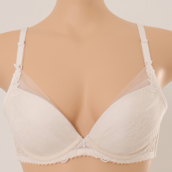 섬세하고 투명한 자카드 레이스 위로 얇고 투명한 망원단을 레이어링하여