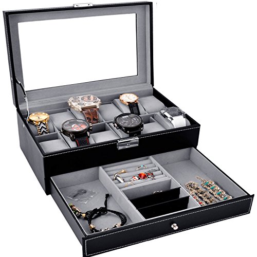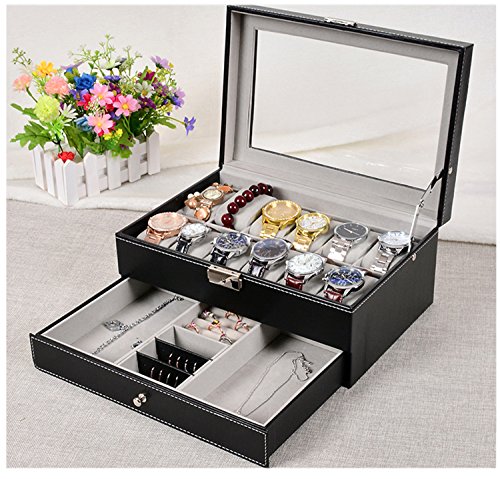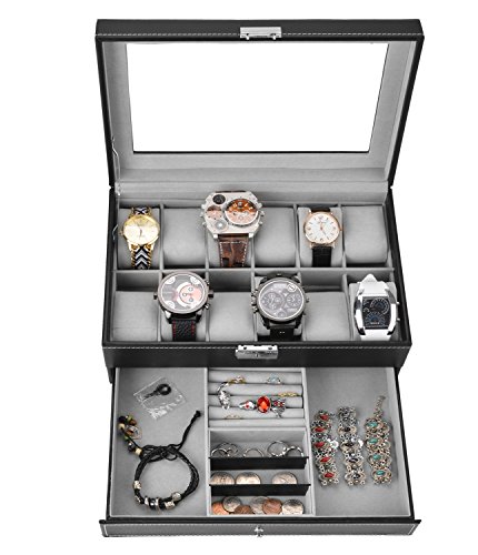 Watch Box Black Leather Watch Display Box 12 Slot Watch Organizer Lockable Jewelry Case w/ Glass Top Drawer, Valentines Day Gifts for Men Women