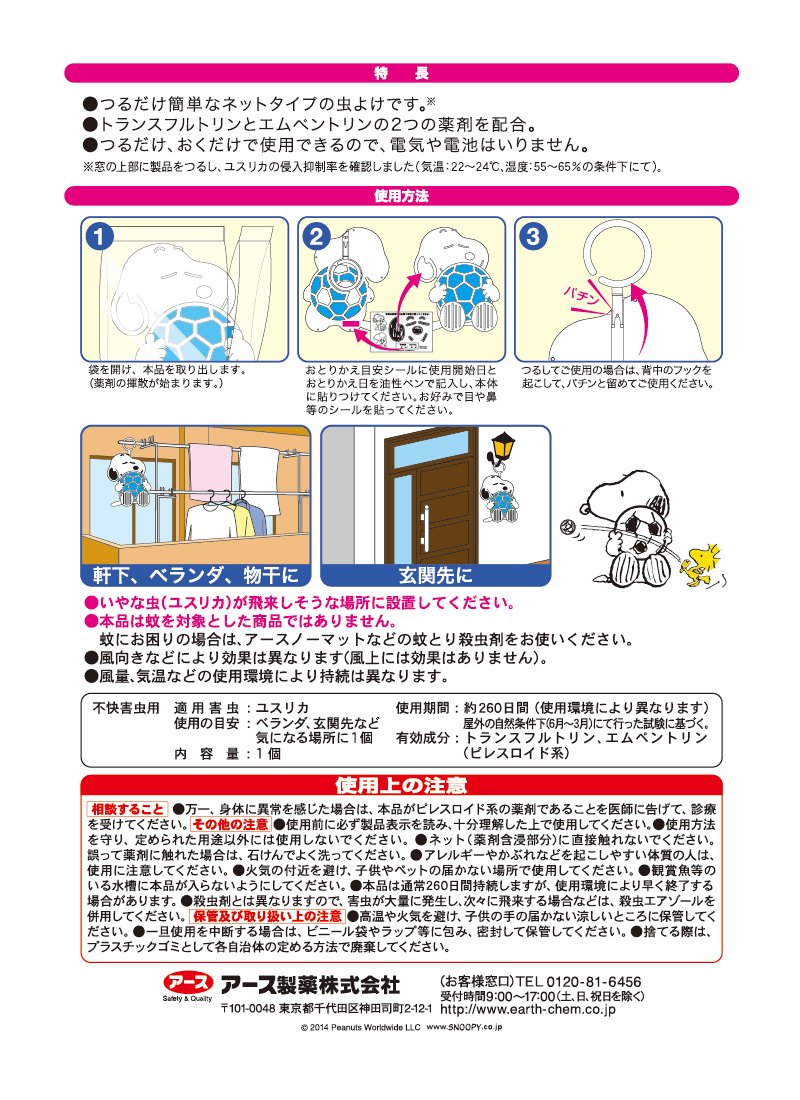 "Earth Pharmaceutical Bapona Snoopy Insect Repellent Net One W 260 days 1 piece" is a cute Snoopy Vine Easy net type insect repellent.