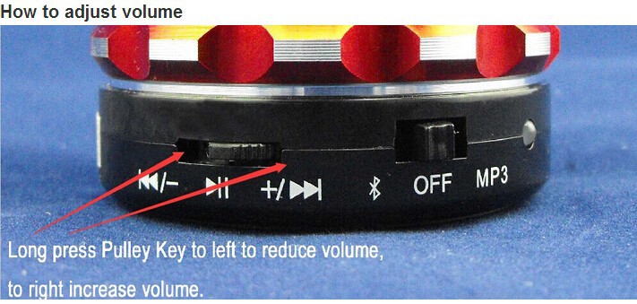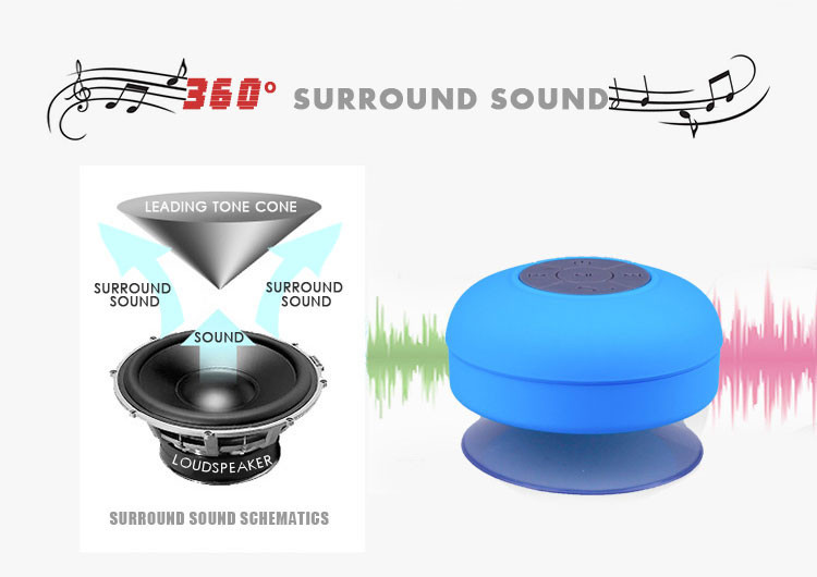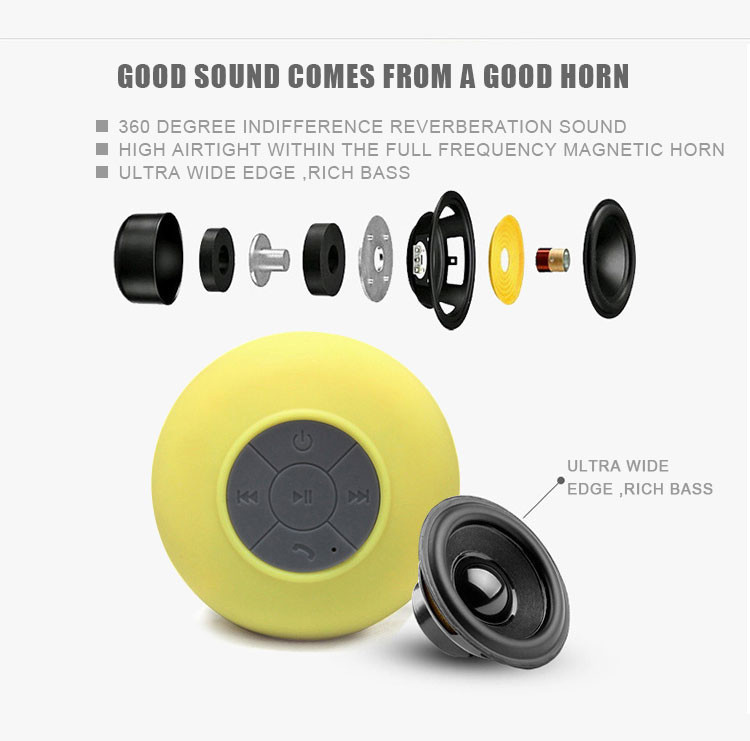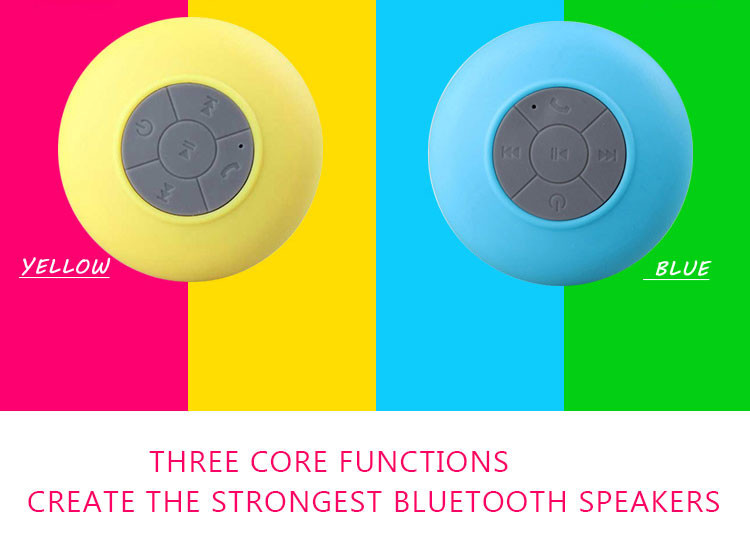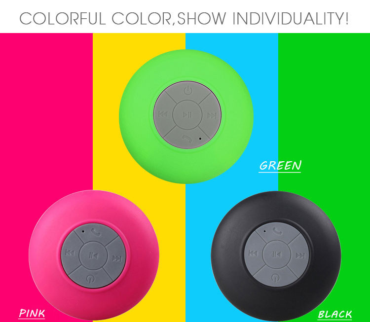 Parameters 1 Bluetooth version:. 3.0 + EDR 2 Bluetooth transmission distance: 10 meters 3 Audio Response: 100MZ-20KHZ 4 When playing length: 6 hours 5 Charge time: 3 hours 6 240 hours standby time 7 charging interface:. DC 5V 8 microphone sensitivity:.-40db 9. Distortion ≤ 1% 10 Speaker diameter: 4 ohms 3W Color: black, white, blue, red, green, yellow Product Features 1 Fashion Waterproof Bluetooth Speaker 2 with a suction cup, can be adsorbed on the wall 3 supports Bluetooth-enabled devices, voice prompts 4 can answer hang up the phone, bathing miss any calls 5.400 mA Built-in lithium battery 6.USB charge 7 waterproof rating 4. Product packaging Bluetooth speaker * 1 Charging cable * 1