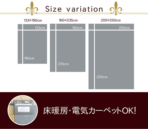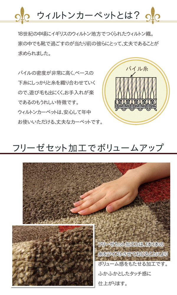 大型商品エジプト製のウィルトン織りカーペットです。ナチュラルな色目にも合う暖かみのあるカラーで、シンプルなデザインです。本商品のパイル部分にはポリプロピレン素材を使用しております。ポリプロピレンはヘタリにくく、耐久性に優れ、繊維の中でも軽い素材です。また、汚れが付着しにくく、遊び毛や毛玉が非常に出にくいという特徴もあります。本商品にはフリーゼセット加工を施しております。フリーゼセット加工をすることによりボリューム感を出し、ふかふかとした肌感触に仕上げました。ホットカーペットカバーや床暖房にも対応しております。安心して年間お使い頂けるカーペットです。