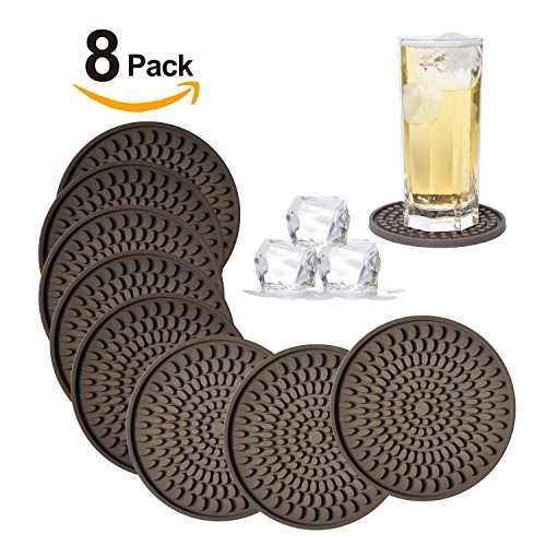 Silicone Drink Coasters Set of 8-Deep Tray,Large 4.3 inches Size Protect Table Desk From Drinks, Beverage,Water or Alcohol Like Whiskey, Beer, Wine,Tropical Cocktails by Kindga (Brown-Oval)