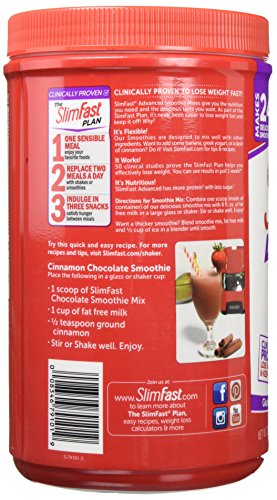 -. Feature : PACKED WITH PROTEIN, VITAMINS, & MINERALS: The Smoothie Powder by SlimFast contains 20g of protein along with 24 essential vitamins and minerals that provide your body with the nourishment to sustain energy for hours / 4 HOUR HUNGER CONTROL: SlimFast Advanced Nutrition High Protein Smoothie Powder is an exceptional meal replacement product that curbs hunger cravings for up to four hours / GREAT TASTE - SlimFast has received multiple awards from Men's Health and OK! Magazine as well as the Chef's Best Taste Award for its exceptional-tasting formula. These meal replacement smoothies can also be used as an ingredient in several recipes / HELPS IN DIGESTION: Unlike other meal replacement products, SlimFast Advanced Nutrition High Protein Smoothie Powder also contains 5 grams of fiber, which helps in digestion
