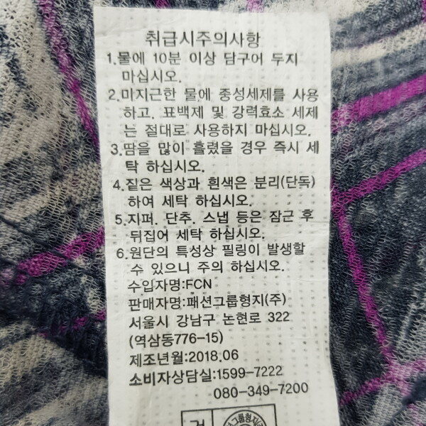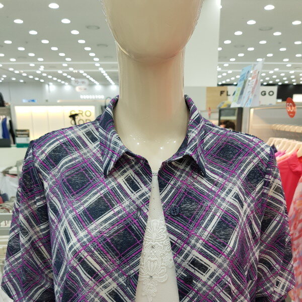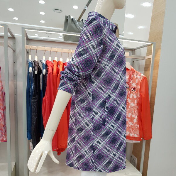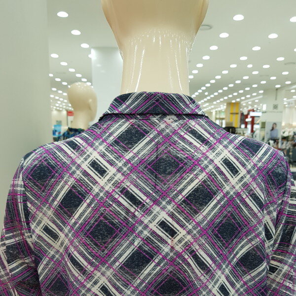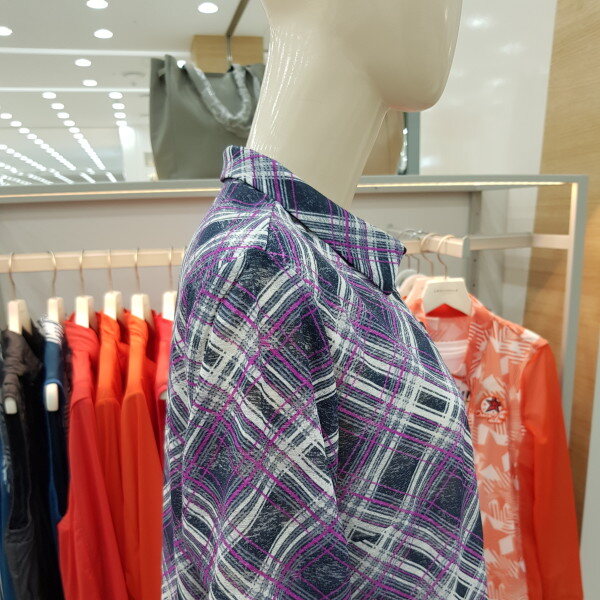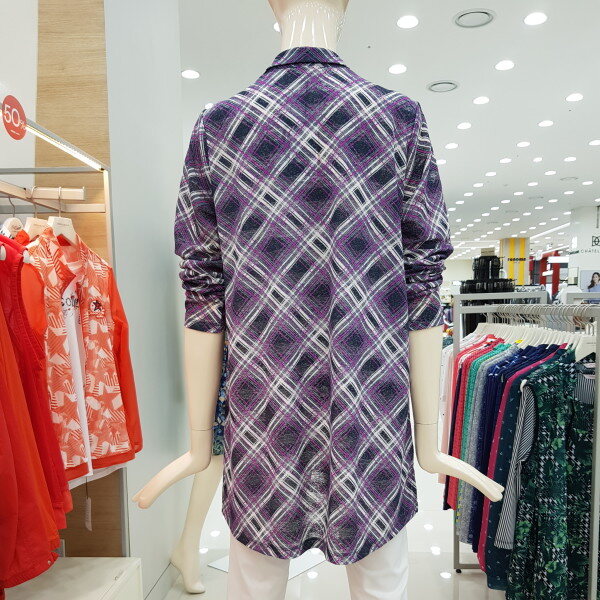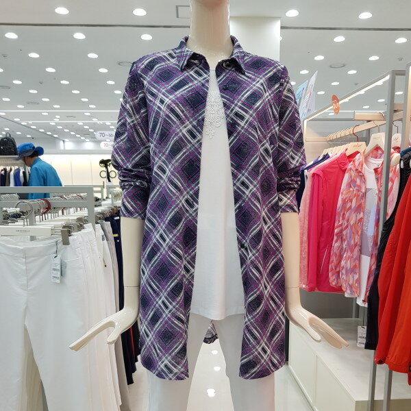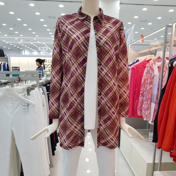 바이어스 체크 패턴의 셔츠형 가디건.스트라이프 자가드 원단을 사용하여 멋스러운 라운지 웨어 아이템으로 CL8FTL901과 셋업 코디 하기에 좋음.