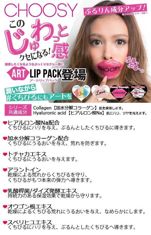| 唇ケアの定番、大人気のCHOOSYシリーズからアート入りのリップパックの登場です!!潤いながらもカラフルでキュート♪可愛いだけじゃない、うるりん成分もUP♪(※ヒアルロン酸Na・加水分解コラーゲン※CHOOSYシリーズ比較) |