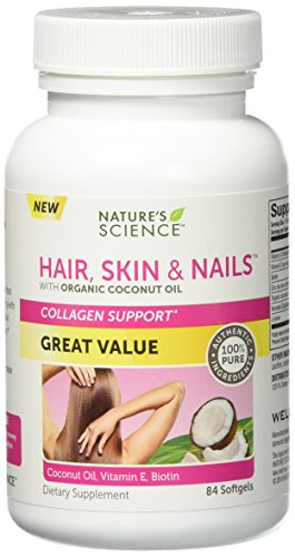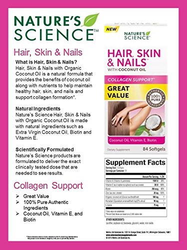 Nature's Science Hair, Skin and Nails with Organic Coconut Oil is our natural formula that provides the benefits of coconut oil along with nutrients to help maintain healthy hair, nails and support collagen formation