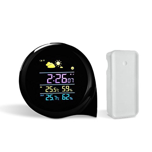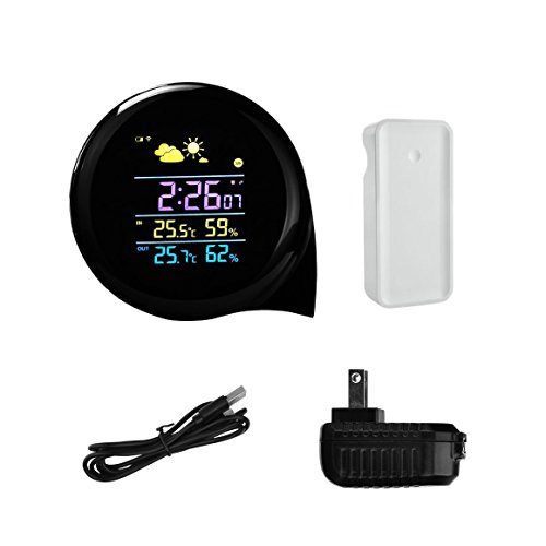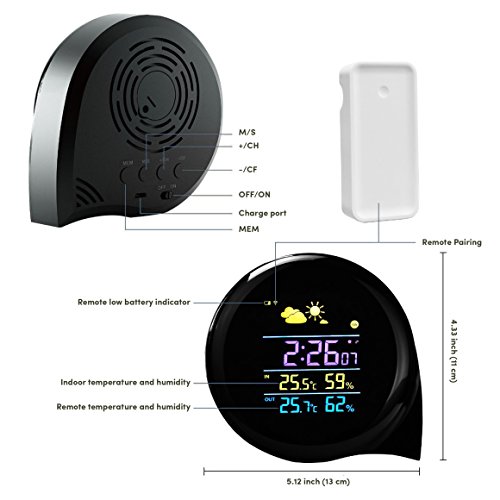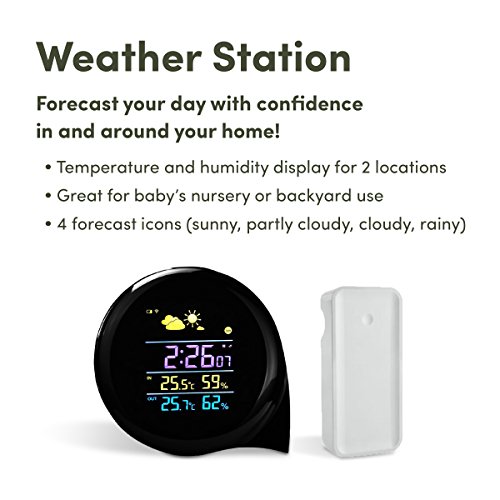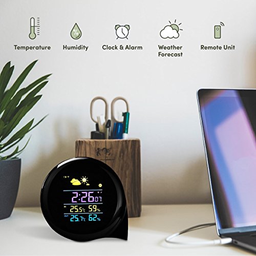 Weather Station Digital Alarm Clock with 120° wide angle easy-to-read color display to show date, time, humidity, and temperature
