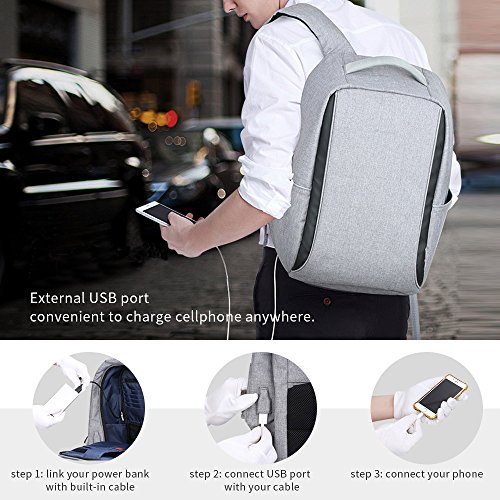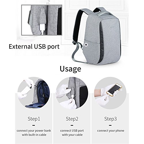 Usage of USB port: Step 1: connect your own power bank with the built-in charging cable of the backpack. Step 2: the extra USB port fixed to the right side. Please connect your electric device with this USB port. Only two steps, super convenient to charge your device anywhere.