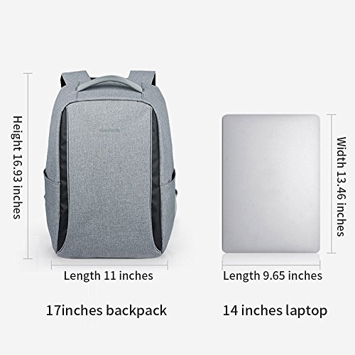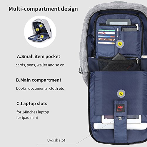 Binding : Personal Computers Product Description Multi-compartment large inner capacity: Inner capacity fits laptop up to 14 inches. Two side pockets are suitable for umbrella or bottle. One card slot and one glasses slot on each shoulder strap. Two slots inside are designed for laptop and tablet, the safe belt has an U disk slot. There are all kinds of pockets and slots, suitable for cards, pens, power bank, notebook and so on.