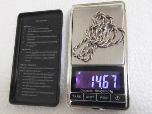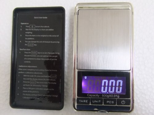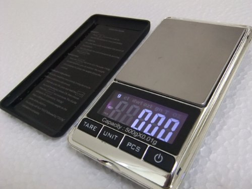 Measurement range 0.01 g to 500 g LCD display Backlight power supply: 2 AA batteries Size: 12 * 6.2 * 2 cm Body weight: 86 g, Gross weight: 115 g Manual: Important but not attached