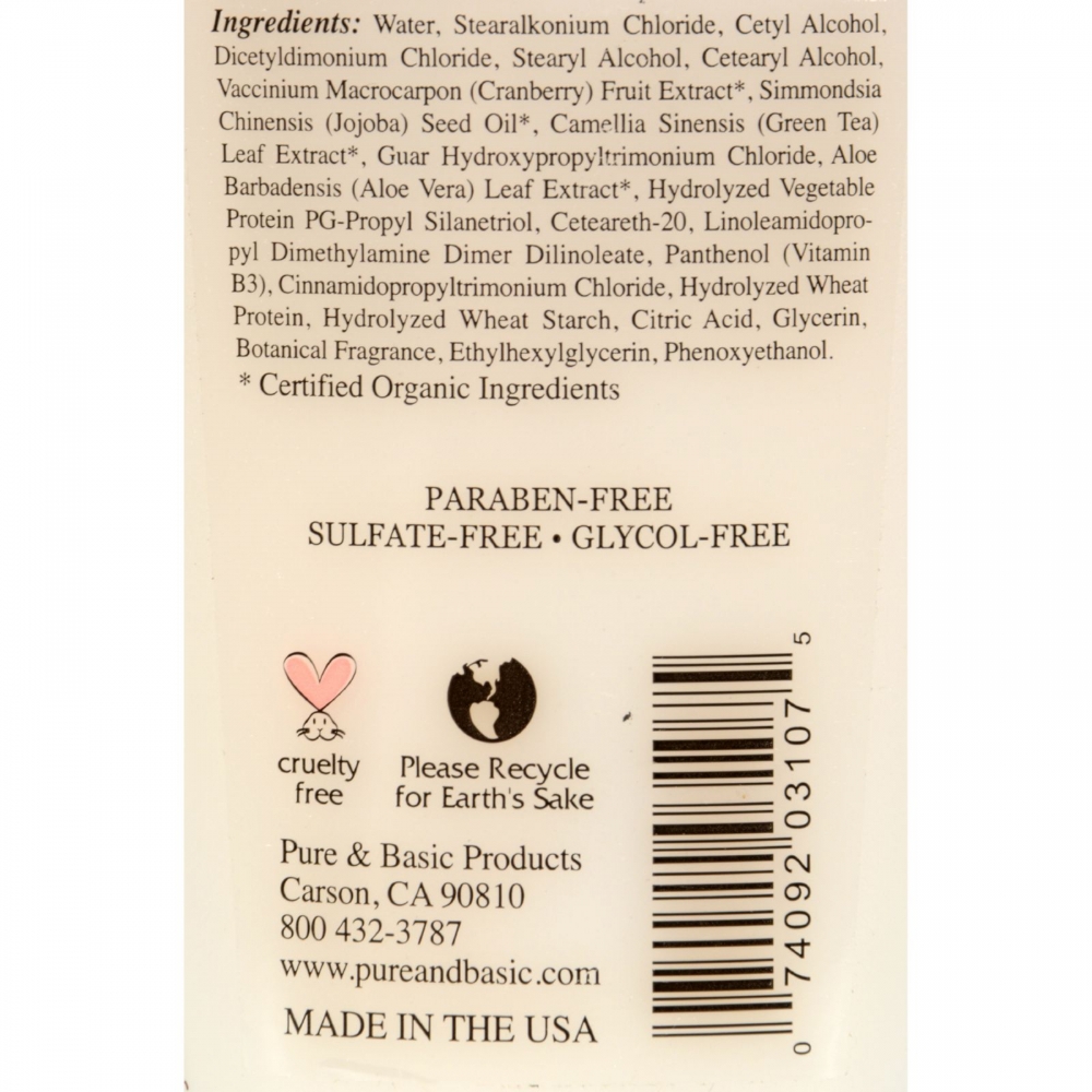 | Finally, natural shampoos and conditioners formulated with high-performing, pure and natural ingredients to give you stronger, healthier hair. Pure and Basic shampoos lather to a thick foam for easy cleansing from root to tip, creating a perfect palette for Pure and Basic's smooth, nutrient rich conditioners. All formulas deliver the powerful anti-oxidant properties of Green and White Tea extracts while certified organic botanicals replenish lost moisture and much needed nutrients. It's easy to find just the right duo for your hair with our cleansing and conditioning systems. Certified Organic Ingredients Safe on chemically-treated hair Gentle enough for your family Sulfate, Glycol, Paraben-Free Formulas for all hair types Cranberry, Jojoba Oil and Aloe Vera infused with Green Tea and Vitamin B3 moisturize and nurture over-stressed hair. An intense cleansing and conditioning treatment duo for dry, damaged hair. Leaves hair softer, healthier-looking, and free of frizz and fly-aways. Fresh cherry aroma with warm almond undertones. Ingredients : Water, Stearalkonium Chloride, Cetyl Alcohol, Dicetyldimonium Chloride, Stearyl Alcohol, Cetearyl Alcohol, Vaccinium Macrocarpon (Cranberry) Fruit Extract*, Simmondsia Chinensis (Jojoba) Seed Oil*, Camellia Sinensis (Green and White Tea) Leaf Extract*, Guar Hydroxypropyltrimonium Chloride, Aloe Barbadensis (Aloe Vera) Leaf Extract*, Hydrolyzed Vegetable Protein PG-Propyl Silanetriol, Ceteareth-20, Linoleamidopropyl Dimethylamine Dimer Dilinoleate, Panthenol (Vitamin B3), Cinnamidopropyltrimonium Chloride, Hydrolyzed Wheat Protein, Hydrolyzed Wheat Starch, Citric Acid, Glycerin, Botanical Fragrance, Ethylhexylglycerin, Phenoxyethanol. *Certified Organic Ingredients Country of origin : USA Size : 12 FZ Pack of : 1 Product Selling Unit : each |
