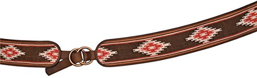 Product DescriptionBlack, red, orange, and white Southwestern print fabric with distressed brown leather trim0