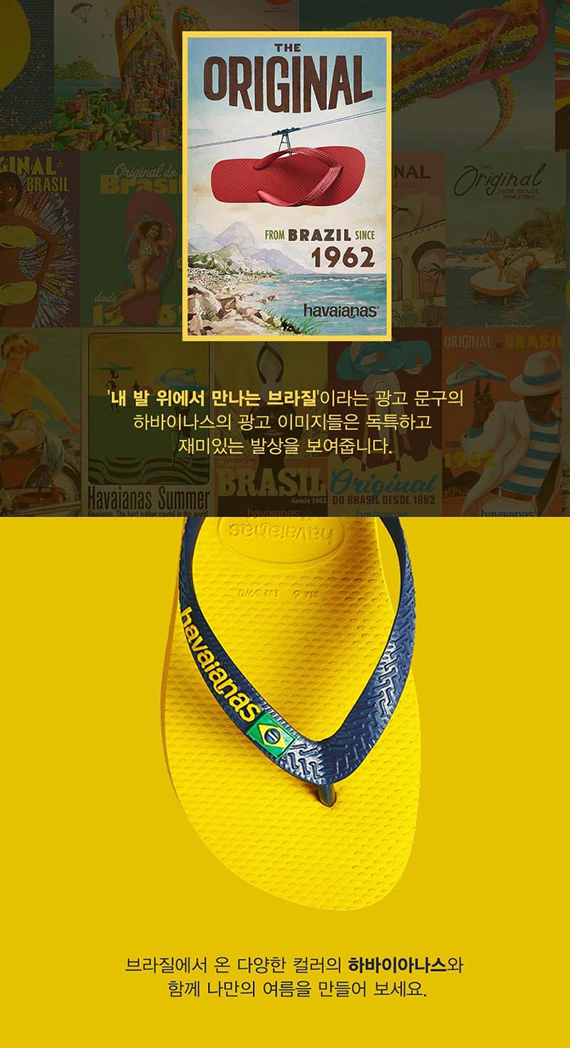 (하바이아나스)는 1962년 직물 스트랩과 볏집바닥으로 된 일본의 ZORI에서 영감을 받아 브라질에서 탄생 되었습니다. 트레이드 마크인 바닥 텍스쳐의 모양은 쌀 모양에서 영감을 받아 제작이 되었습니다.