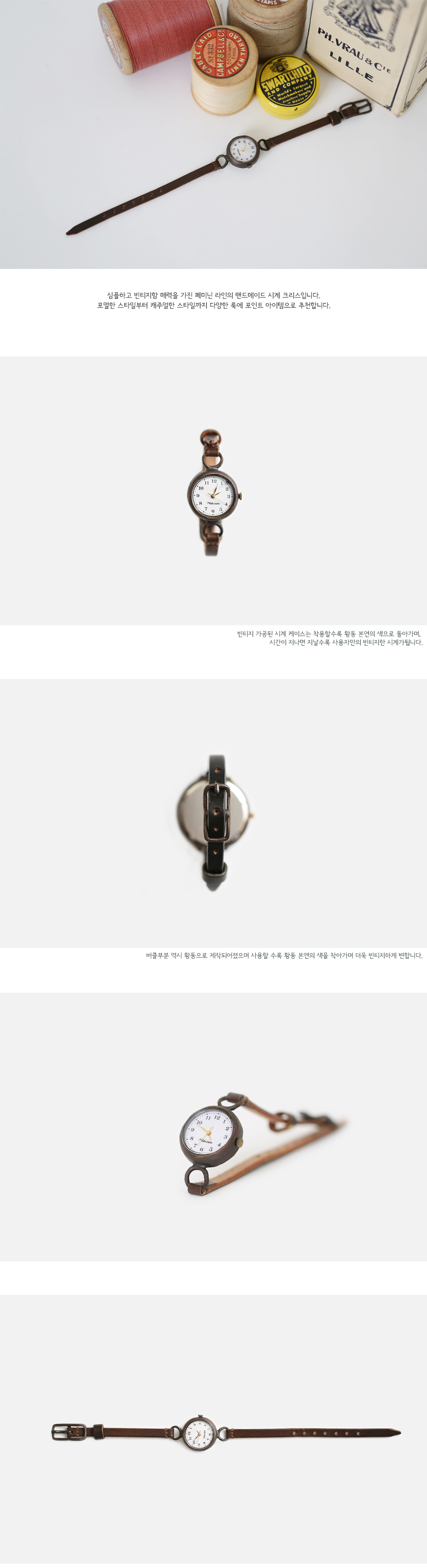 | 메탈엣린넨의 빈티지 황동(brass) 시계 케이스는 착용할수록 점점 밝아지며, 자연스러운 에이징이 되는 가죽 밴드와 함께 시간이 지나면 지날수록 사용자만의 빈티지한 시계가됩니다. 시계에 사용된 황동은 산화되면서 녹청(patina)이 발생할 수 있으나, 금속광택제(metal polishing compounds) 등으로 닦으면 다시 원래의 황동색을 되찾을 수 있으며 황동만의 독특한 소재감을 느끼실 수 있습니다. Handcraft watch Kreis(크리스) 심플하고 빈티지함 매력을 가진 페미닌 라인의 핸드메이드 시계 크리스입니다. 포멀한 스타일부터 캐주얼한 스타일까지 다양한 룩에 포인트 아이템으로 추천합니다. 수십 번, 많게는 수백 번 두드리고 구부리고 붙이는 작업을 거쳐야 비로소 하나의 시계가 완성됩니다. 만나면 만날수록 즐거운 사람처럼 시간이 지나면 지날수록 더욱 빈티지해지며 나만의 시계가 됩니다. 모든 시계는 생활방수가 가능합니다. 다만, Vegetable Leather로 제작되는 시계 밴드 특성상 많은 양의 물이 닿을 경우 가죽에 변형이 생길 수 있으므로 주의하시기 바랍니다. Watch Face Size 24 × 24 × 8 (mm) Watch Strap Width 6 mm Material Brass, Vegetable Italian Leather, Seiko Quartz Movement 제작기간 주문일로 부터 5-7일 원산지 한국 |