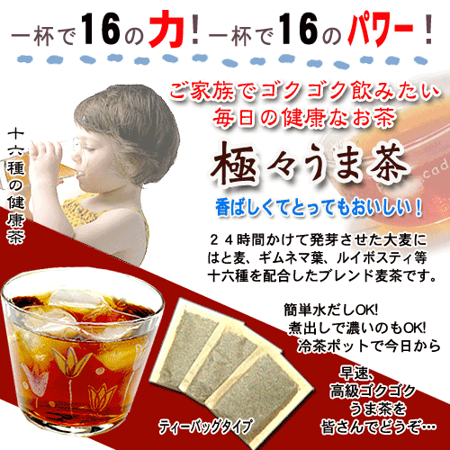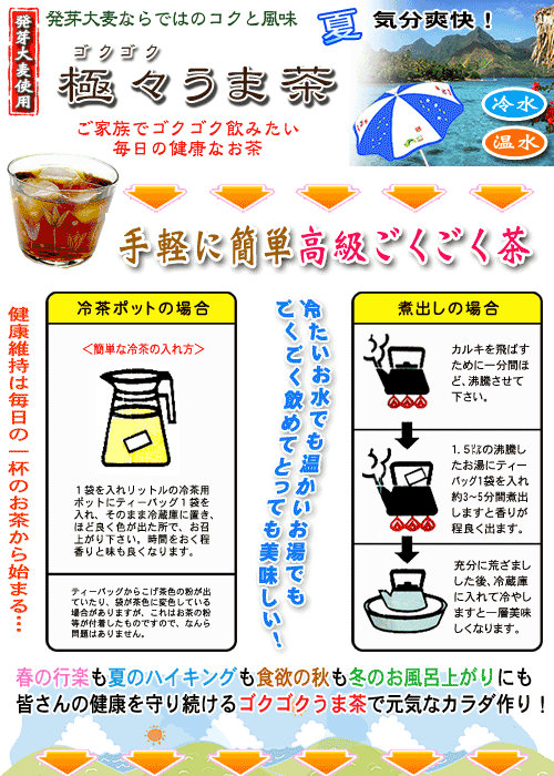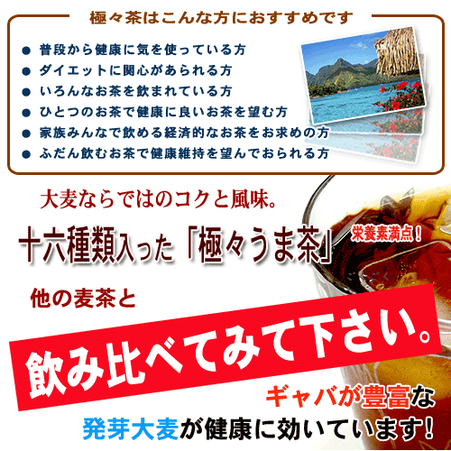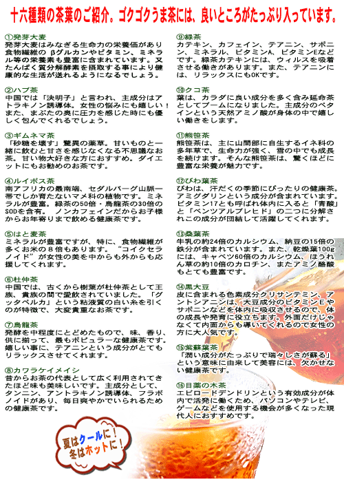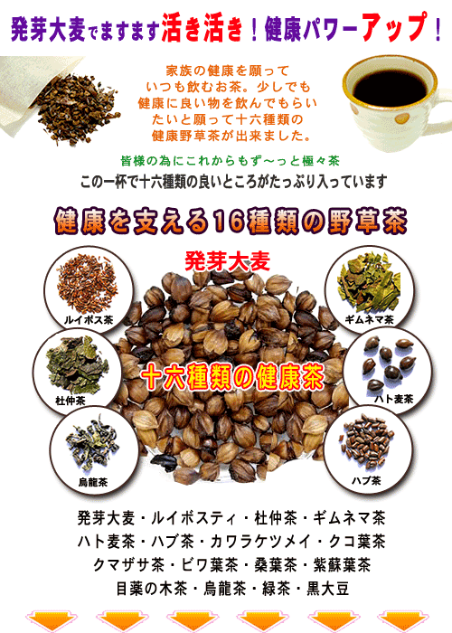 発芽大麦ならではのコクと風味。24時間かけて発芽させた国産大麦にハト麦、ギムネマ茶、ルイボスティ等16種類を配合した高級ブレンド麦茶です。 簡単水だしOK!煮出しで濃いのもOK!冷茶ポットで今日から早速、高級な極々うま茶を皆様でお召上がり下さい。 ◆ 健康茶の内容 発芽はと麦・ハブ茶・ギムネマ茶・ルイボス茶・はと麦茶・杜仲茶・烏龍茶・カワラケツメイ・緑茶・クコ葉・クマザサ茶・ビワ葉茶・桑葉茶・黒大豆・紫蘇葉茶・目薬の木茶 |