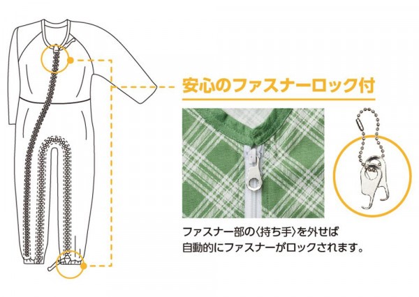 フルオープンできるので、寝たきりの方でも無理なく着脱ができます。前ファスナーは寝たきりの方の更衣にとても便利。股ファスナーはオムツの交換時に便利です。 |
