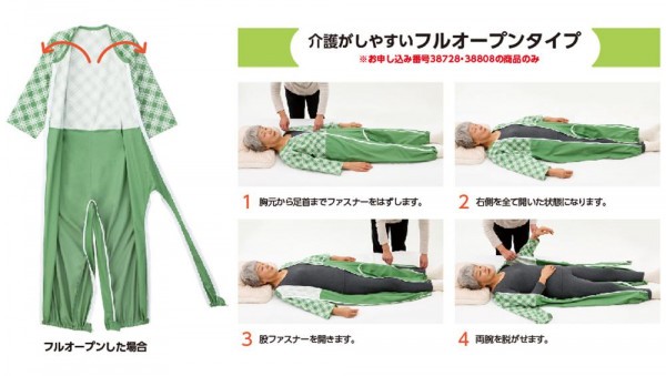 | フルオープンできるので、寝たきりの方でも無理なく着脱ができます。前ファスナーは寝たきりの方の更衣にとても便利。股ファスナーはオムツの交換時に便利です。 |