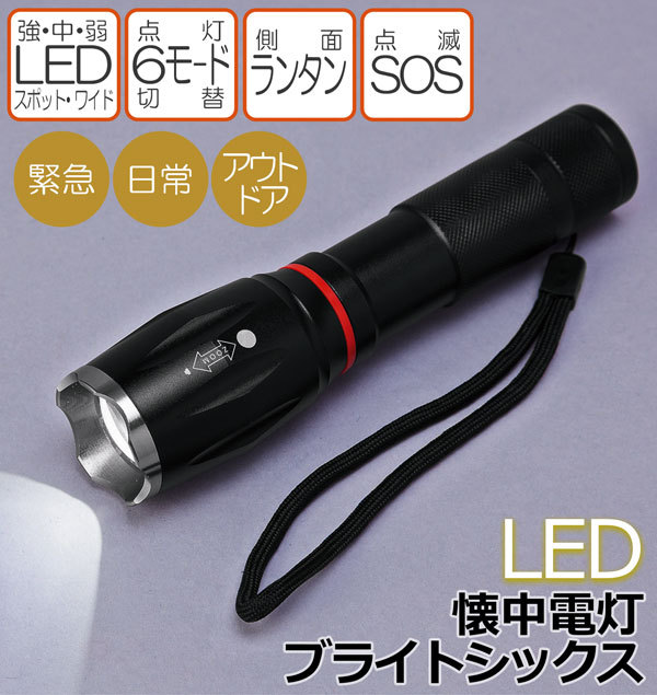 | 6つの光モードを搭載したLED懐中電灯ブライトシックス。先端ライトは強・中・弱にきり替えられ、更に、本体を伸縮することでスポット・ワイドに調整可能なため、様々な用途に対応できる多機能懐中電灯です!また、緊急時はもちろんアウトドア等にも、側面ランタンが大活躍!使用場所に合わせて、マグネットや直置きで明るく照らします。 |