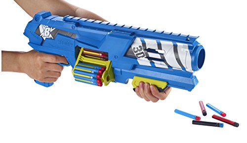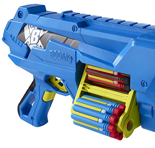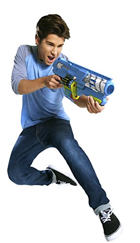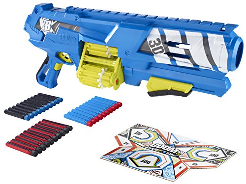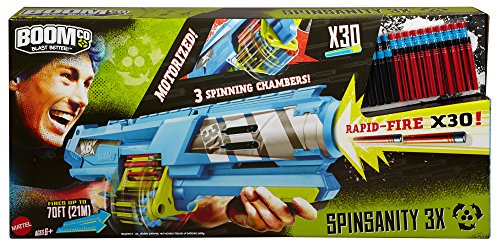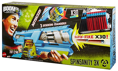 BOOMco. - BLAST BETTER! SPINSANITY 3X takes blasting to a new level with 3 awesome, rotating barrels for 3 times the firepower and ultra-rapid reload speeds! Features 3, 10 dart chambers for 30 darts total and is motorized for rapid fire blasting action! Once you’ve blasted through one chamber, use the pump-action mechanism to move to the next chamber and keep the action going without having to reload – blast, pump, repeat! SPINSANITY 3X has a 30-dart capacity and fires up to an epic 70 feet. It comes with three different dart colors – 10 of each - for awesome variety, and SPINSANITY 3X features a blaster rail to attach other BOOMco. accessories for even more firepower! Also includes 1 Smart Stick target. Requires 6 AA batteries, not included. Colors and decorations may vary.Feature
