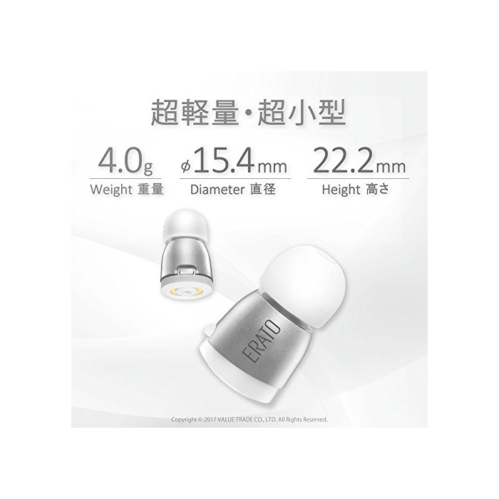 세계 에서 가장 컴팩트한“참된 wireless 헤드 세트 이어폰”“핸드프리 통화용 마이크 ”탑재에《스마호》에 닿는 일 없이 통화,음악 재생이 즐길 수 있습니다.나노 코팅에 스포츠나 땀,물보라 등에 견딘다“방수 성능 부착”.본체 중량4.0g,사이즈φ15.4mm x 22.2mm의 초경량 초소형 타입.본체 내부에,wireless용의 Bluetooth용 팁(칩) 안테나를 실장한 기반,충전식의 리튬 이온 배터리(용량50mAh)고, 마이크로 스피커 드라이버를 얻을 수 있어 있습니다.