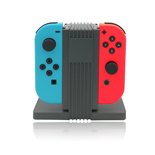 -. Feature : Easy slide-in design connects each Joy-Con to charger.Powered via USB. / Allows you to securely store and charge up 4 Joy-Con Controllers stimultaneously / Distinct dual colored LED light indicator showing charge status (Charging: Red,Fully charged:Green) / Low-profile design ideal for all entertainment centers which can be used as a storage dock when not in use. / Full charge to 4 controllers simultaneously within 3 hours.Power through the Type C port.Comes with a 3.3FT(1.2 Meters)Type Cable.