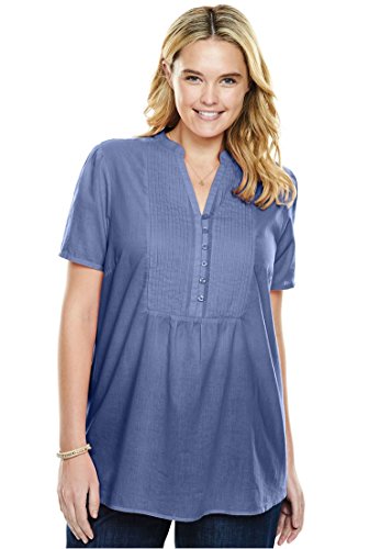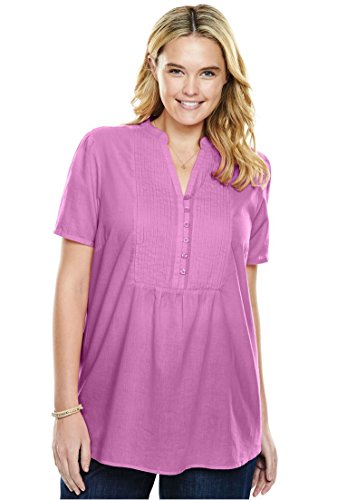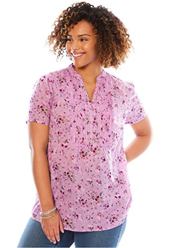 Studio : Woman Within Publisher : Woman Within Binding : Apparel Product Description This pretty A-line tunic in soft colors is easy to wear. Its mandarin collar looks so on-trend and pintucking details release into fullness for an easy fit, with roomy comfort. Our plus size tunics and plus size tops are feminine, beautifully detailed and a fashion find for a pure cotton style. But don't take our word for it, customers love it: "This blouse is great. Lightweight, with a nice easy fit. The colors are very pretty. They don't have that ‘wallpaper/slipcover look' that so many patterns do in larger sizes. The overall length is wonderful. No riding up or clinging. The sleeves are just right. It can be worn for just about any occasion." Customer, Los Angeles County pintucked front on both sides of button placket for fullness ideal with a jean or chino Mandarin stand collar gorgeous exclusive country floral prints Y-neck has button loop placket comfortable short sleeves shirring detail great tunic length: 30" a nice look paired with our knit leggings don't forget to complete the look with a comfortable pair of our flats soft washable pure cotton cambric, imported Women's plus size top plus size shirt in sizes M(14W-16W), L(18W-20W), 1X(22W-24W), 2X(26W-28W), 3X(30W-32W), 4X(34W-36W), 5X(38W-40W) 0