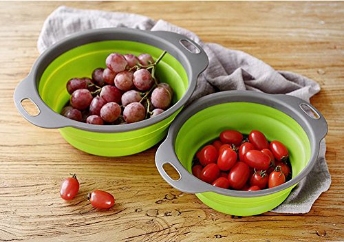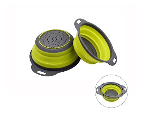Color: Green Superior Kitchen workhorse: To have a new experience with our collapsible silicone strainer. Made from high grade food safe silicone, our colanders are strong and guaranteed to last. It is BPA free and fully approved by FDA, so there is no risk of food poisoning as it is far better than metal and plastic strainers. It is collapsible to no more than 2 inches high and so saves tons of space in the kitchen. Whether your kitchen is big or small, this colander set will safe you some much needed space, while performing the tasks you need. Its ergonomic design makes it very easy and comfortable to use. Cleaning it is a breeze as it is dishwasher safe and can easily be stored away in a drawer or hung on the shelf with the little opening on the rim. A MUST have in every kitchen!
