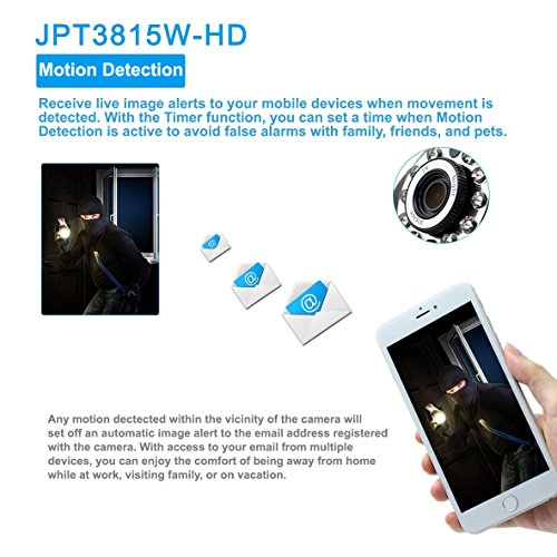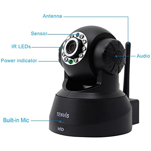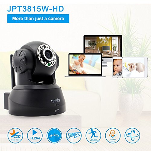 -. Binding : Electronics -. Brand : TENVIS -. Color : Black -. EAN : 0859984000526 -. Feature : Wireless network connection. No complicated wiring.Automatically detect moving objects and trigger alarm.Send alert emails to user and upload screen capturesto FTP server / Infrared Night Vision: Automatically turn on in low light and in darkness / Mobile Devices: Support remote viewing on mobile devices. iPhone/iPad/Android OS supported. / Two-way Audio: Communicate with family and friends on mobile devices. Talk to camera or listen to camera / Pan/Tilt Control Move the camera as you desired. Pan horizontally up to 340°, tilt vertically up to 90° -. Label : TENVIS -. Manufacturer : TENVIS -. Model : JPT3815W-HD -. MPN : JPT3815W-HD -. PackageQuantity : 1 -. PartNumber : JPT3815W-HD -. ProductGroup : Photography -. ProductTypeName : SURVEILANCE_SYSTEMS -. Publisher : TENVIS -. Studio : TENVIS -. Title : TENVIS JPT3815W-HD Wireless Surveillance IP/Network Security Camera, Baby Monitor, Night Vision, Black -. UPC : 859984000526 -. Warranty : 1 Year Warranty