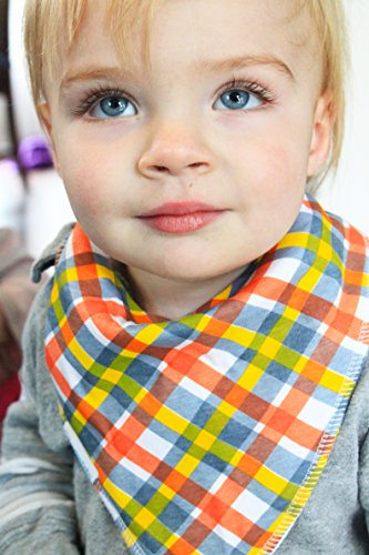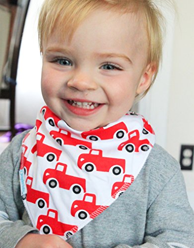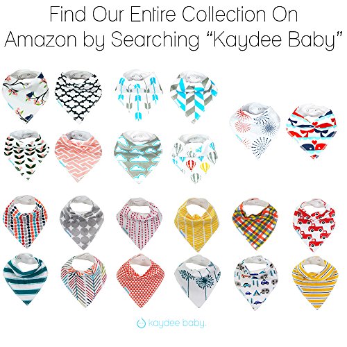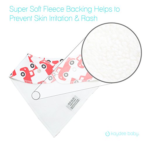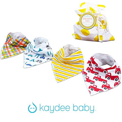 - Feature : SUPERIOR BABY BANDANA DROOL BIBS - Made with 100% Soft Cotton with an Ultra Absorbent Back Polyester Fleece Back Keeps Dribble and Drool Off of Baby, Infant, Toddler Clothes. Gentle to the touch helps keep babies tender skin dry and rash free. Great alternative and much more comfortable than plastic bibs or waterproof material. Very handy to use as a burp rag or burpy bib and easy to store in diaper bags or stroller compartments. / FREE GIFT BAG INCLUDED - Kaydee Baby Bibs are Super Fun and Hip! Your Baby will Dress in Style with our Unique Designs. Our Set of 4 Includes Fun Camping Scene, Mustard Yellow Stripe, Fantastic Plaid and Super Red Truck! These are the perfect accessory to any baby boy outfit with the added bonus of protecting their clothes. Already packaged and ready to be gifted! / EASY SNAPS ENSURE BIB STAYS ON - Kaydee Baby Bibs come with 2 Nickle-Free Adjustable Snaps For Growing Babies between 3 and 24 Months. They Stay on Even While Baby is Playing Freely. These are a great alternative to velcro straps which are easy to pull off and ruin clothes in the wash. Washing machine safe. Keeps shape after wash! / BACKED BY THE KAYDEE BABY PRODUCTS GUARANTEE - We guarantee you will love the our bandana drool bibs, and if you aren't absolutely satisfied, return it within 30 days for a full refund, no questions asked. / UNIQUE GIFT - Kaydee Baby Bibs make for a Unique and Fun Gift! A Must Have for Baby Showers, Birthdays, Christmas and Any Occasion! Perfect Gift Basket Set! Mothers everywhere are raving about Kaydee Baby Bandana bibs. Fun, affordable, adorable and serve their purpose well.