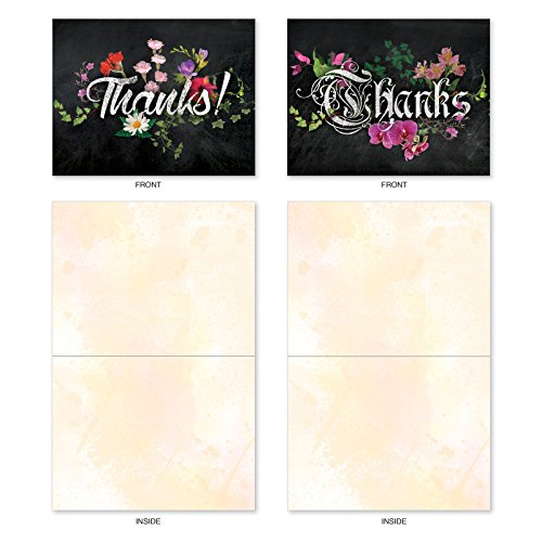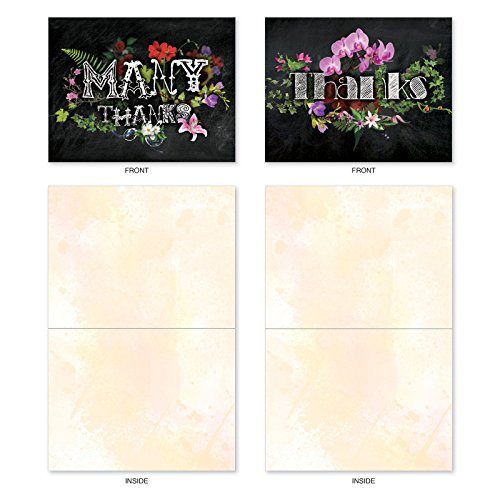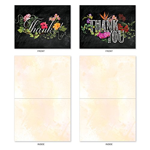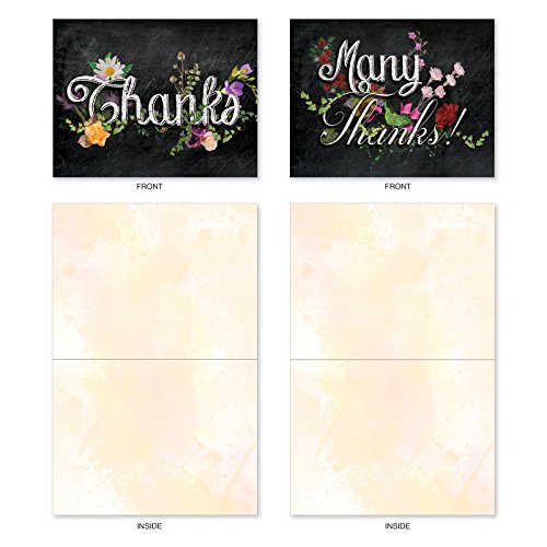 M2358TYB Chalk And Roses: 10 Assorted Blank Thank You Note Cards Featuring Chalkboard Styled Written Gratitudes Combined with Beautiful and Colorful Floral Sprays, w/White Envelopes.