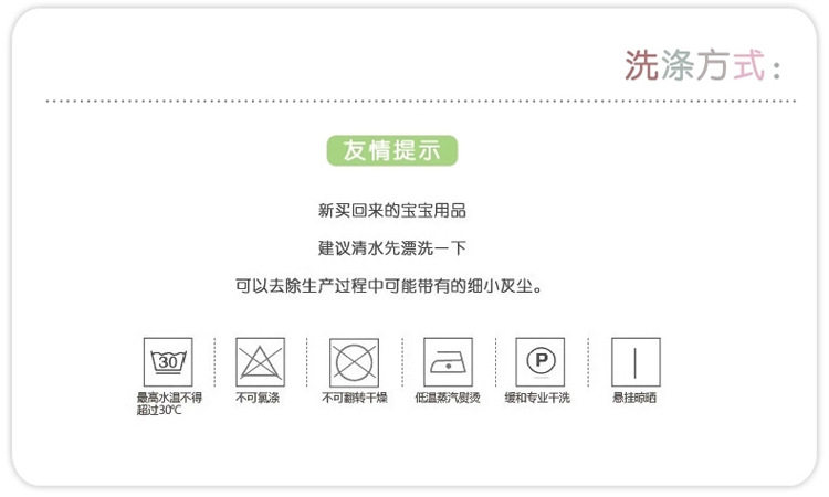 收到宝贝后亲按商品标识的洗涤方式洗涤。切勿放开水里面煮或者开水烫。切勿使用带漂白功能的洗衣液或者肥皂洗涤