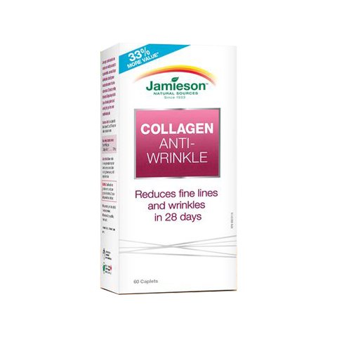 As we age, our skin begins to lose Collagen causing it to sag and wrinkle. Jamieson Collagen Anti-Wrinkle is clinically proven to reduce the number of deep wrinkles in 4 weeks by providing Collactive Collagen to two layers of the skin (epidermis and dermis) to help replace lost structural collagen and achieve firmer, more youthful-looking skin. Ingredients CollativeTM Hydrolyzed Collagen 500 mg Directions Take 4 capsules daily. Legal Disclaimer Actual product packaging and materials may contain more and different information than what is shown on our website. We recommend that you do not rely solely on the information presented and that you always read labels, warnings, and directions before using or consuming a product.Feature