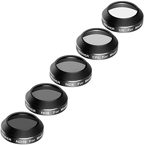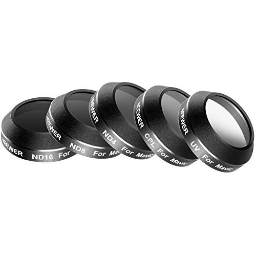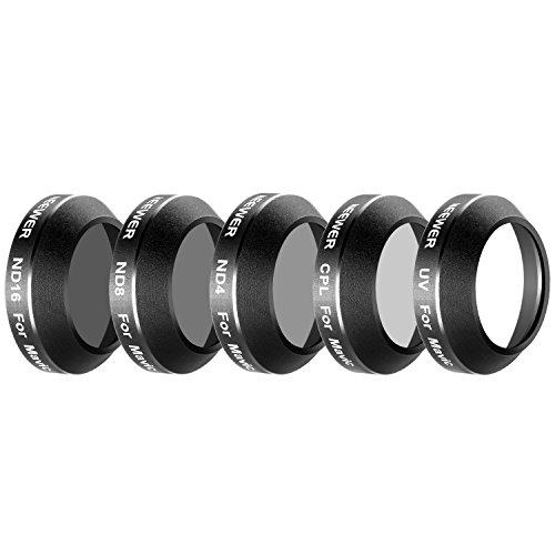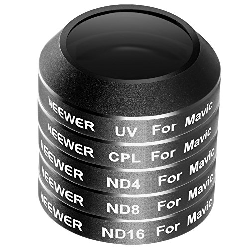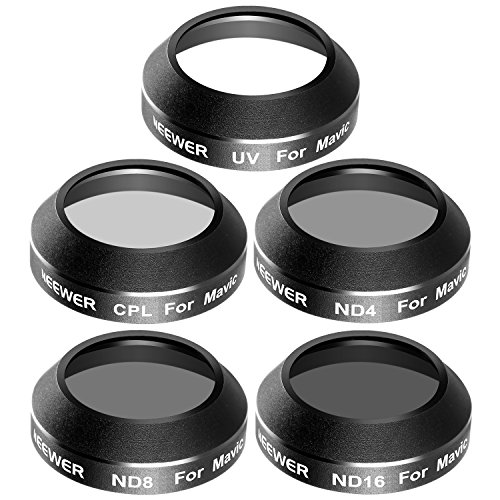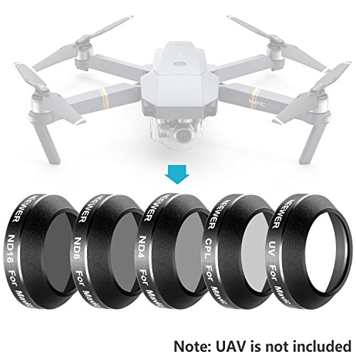 Note: This kit is specialized for DJI Mavic Pro; Quadcopter and camera are not included Descriptions: (1)UV Lens Filter: UV filter reduces haze and improves contrast by minimizing the amount of ultraviolet light. (1)CPL Filter: CPL filter is great for removing unwanted reflections from non-metallic surfaces such as glass or water. Take richer scenic shots and notice improved clarity in distant objects by cutting through haze and increasing color saturation. (1)ND4 Filter, (1)ND8 Filter, (1)ND16 Filter: ND filters (Neutral Density) reduce the amount of light reaching the film without affecting the color. They are typically used on cloudy to partly cloudy days for smooth cinematic video and great for portraiture and outdoor scenes. ND4 reduces the exposure by 2-full stops ND8 reduces the exposure by 3-full stops ND16 reduces the exposure by 4-full stops Package Contents: 1 x UV Lens Filter 1 x CPL Lens Filter 1 x ND4 Lens Filter 1 x ND8 Lens Filter 1 x ND16 Lens Filter 0