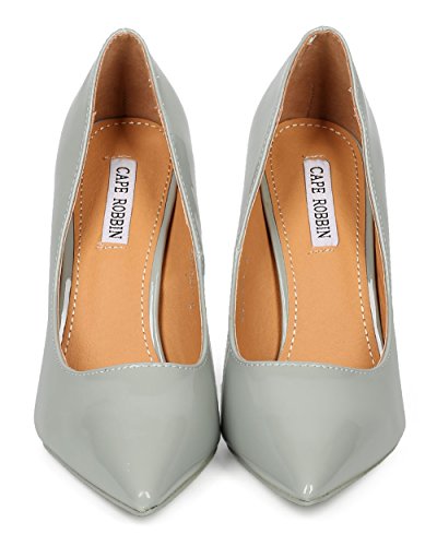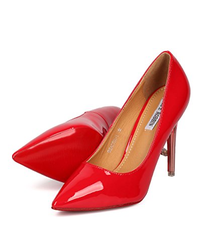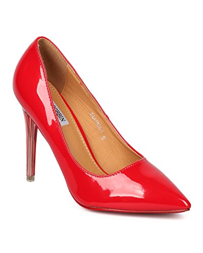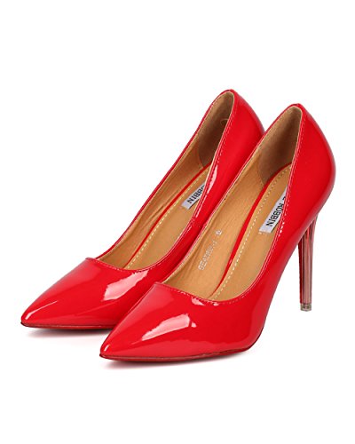 Product Description These classic pumps are made with a patent leatherette upper, pointy toe and single sole. Also made with a stiletto heel and easy to slip on design. 0