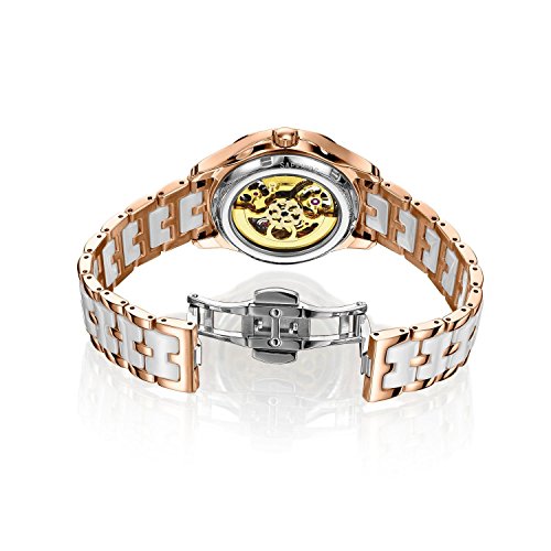 Rosegold stainless steel embedded white sleek ceramic band with push-button hidden clasp