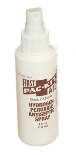 Pac-Kit hydrogen peroxide pump spray. Hydrogen peroxide is a topical antiseptic in a convenient bottle. Use for cleaning wounds and fighting infection. Ideal as a local antiseptic for abrasions or minor cuts. Hydrogen peroxide also disinfects equipment surfaces. Perfect for standalone first aid or as a refill for a kit. It comes in 4-ounces pump spray bottle.