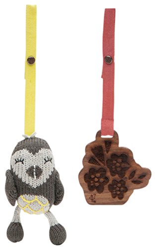 The wooden teething toy is made from untreated hardwood and finished with vegetable seed wax. The knit toy was hand-knit at an artisanal women's collaborative in Peru using G.O.T.S. certified organic cotton yarn and wool stuffing. Our stroller toys can be used on their own or attached to our "Play Gym".