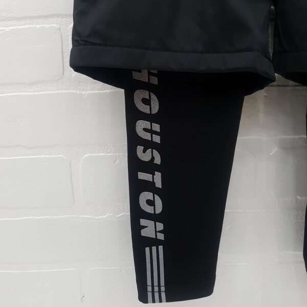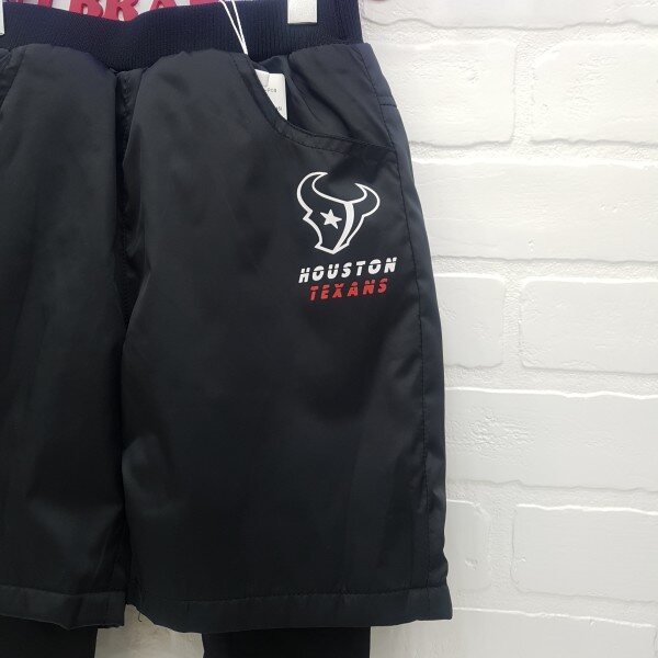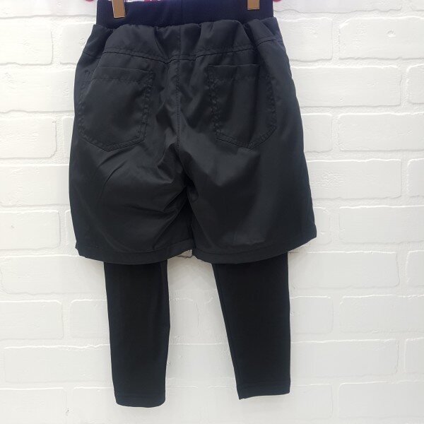 양쪽에 화섬 소재의 반바지와 폴리기모 스판 레깅스가 믹스된 레이어드 팬츠 앞 팀 마크 나염과 레깅스 위 반사 나염이 포인트
