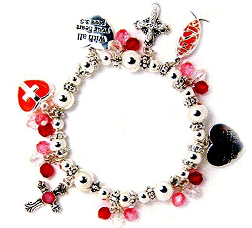 -. Feature : Polished Silver Tone Bracelet / Pink Themed Beads and Charms / Excellent Faith Statement / Stretch Band for Comfort Fit / Nice Gift Box Included