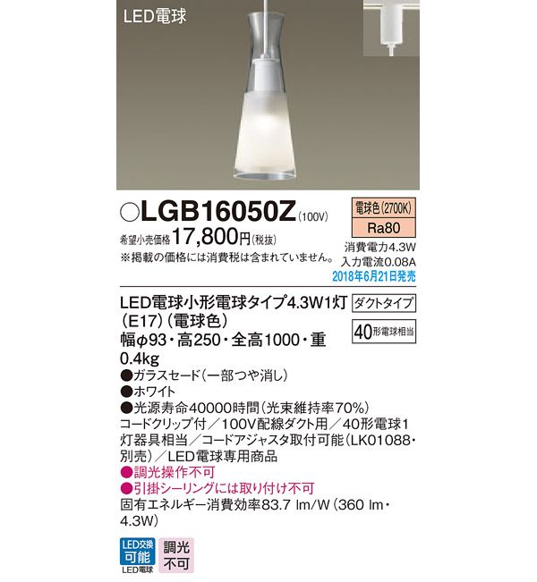 ●光源:LED電球小形電球タイプ4.3W1灯(E17)(電球色)、色温度:2700K、光源寿命40000時間(光束維持率70%)