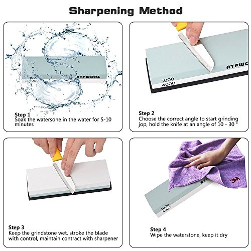 - 【Easy Using】Soak the stone in the water for 5 minutes, sharpening the knife(both sides) in the #1000 grit for 15 minutes, then do the same on the #6000 grit, then you knives just like the new ones