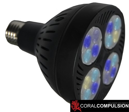 The first PAR bulb of its kind, a true 35 watts of LED power packaged into a tiny PAR38 bulb. Custom designed 80 degree honeycomb quad optics blend the light from 4 groupings of 4 separate LEDs to mix the colors more evenly so you don't get any spot lighting of colors, while still spreading the light 16" and penetrating up to 36" deep. Each bulb is fan cooled internally to stay cooler than any other PAR bulb yet, and as always covered by our 3 year warranty. The Coral Compulsion 40w SuperBlu bulbs utilize a combination of warm white 3000k, 420nm true violet, 455nm royal blue, and 470nm cool blue to get a very blue looking tank color and crazy pop and glow from all of your flourescent corals! These bulbs are great for nano size aquariums, or use multiple for larger aquariums. They use a standard e26 screw in style base and can be hung over your tank, or clipped on depending on your fixture preference. These bulbs produce great growth, and bring out lots of color in your corals.Feature