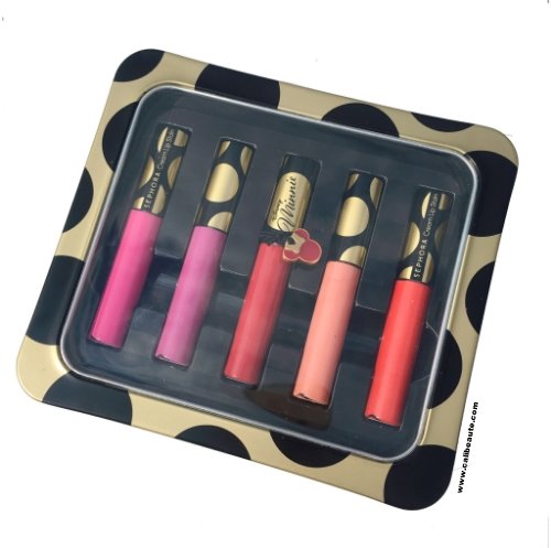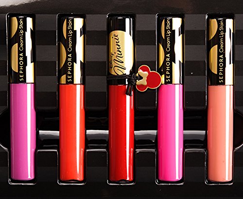 This set contains: - 5 x 0.1 oz Lip Stains in African Violet, Mandarin Muse, Always Red, Whipped Blush, Peach Tart - Limited-edition Minnie tin
