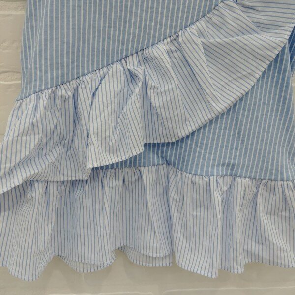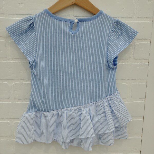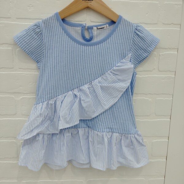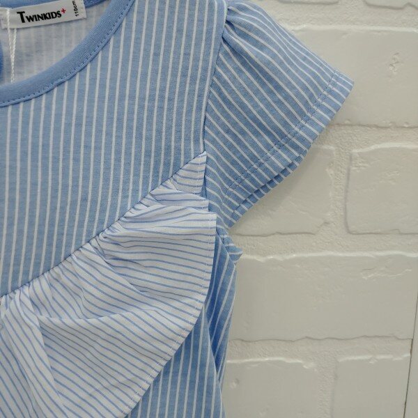 셔링 소매와 언발란스한 스트라이프 프릴단이 포인트인 여아 티셔츠.
