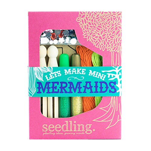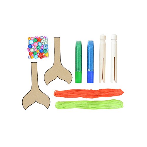 This all-in-one kit includes: 2 wooden peg dolls, kraft paper mermaid tails, sparkly rhinestones, embroidery thread, glitter glue, and instructions.