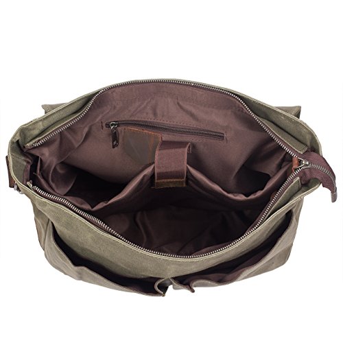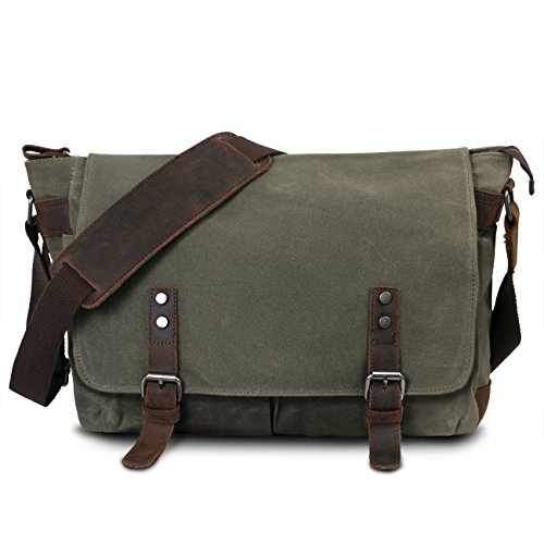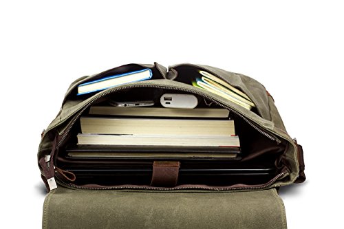 -. Feature : ★SIZE -- L * W* H 13.78" x 4.3" x 10.6" / 35* 11* 27cm , adjustable shoulder strap . Easy to carry 13.3" MacBook Pro/Air , 14 inch laptops notebooks. Weight : 2 pounds. / ★SUPERIOR MTERAIL -- This messenger bag is made of high density wax canvas fabric + genuine leather trim + quality hardware zipper. Wearable, durable, sturdy and waterproof. / ★FEATURES -- Vintage Out-Looking, stands for urban old fashion icon, simple and beautiful. Never Out of Shape, hard canvas keep the bag in good condition for a longtime use. Portable Handle on the back, very convenient to carry on as a handbag. Magnetic Buckles, easily open and close. / ★LARGE CAPACITY -- 2*pockets in front flap; 1*large main zipper pocket (1*laptop compartment with padded sleeve , 1*small inner zip pocket , 2*inside-slots , 2*pen slots). Can hold iPad , A4 file magazine , books , wallet , phone , snacks, water-bottle etc. / ★A BEST GIFT -- It can be a School Book-bag / Causal Shoulder Bag / Laptop Messenger Bag / Student Satchel / Overnight Travel Bag for teen girls boys, men or women. Good for traveling , hiking , camping.